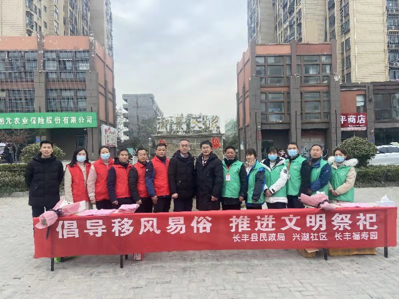 12月18日上午,冬至来临之际,为引导老百姓摒弃传统丧葬陋习,进一步推动绿色文明殡葬工作。长丰县民政局联动长丰福寿园、长丰县水湖镇兴湖社区,以“倡导移风易俗 推进文明祭祀”为主题,在长丰县水湖镇兴湖社区周边开展2020年文明祭祀冬至户外宣传活动,县民政局社会事务科全员、长丰福寿园及社区等工作人员参加了此次活动。